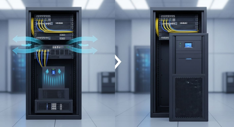 | Полноценная стойка, «холод/горячий» коридор | Порядок и airflow | Rack | Единая плоскость охлаждения, короткие кабели, PDU 0U |